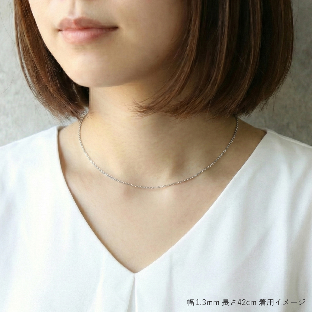 ロングネックレスの場合で2〜3g。ステンレス・シルバーの約1/2、PT900・K18の1/4、K24・Pt1000の約1/5の重さです。ロングチェーンにしても首や肩に負担をかけない軽さです。