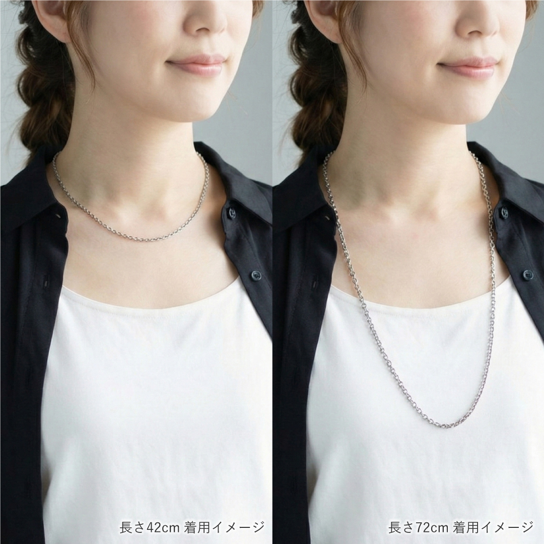 定番の丸あずきチェーンの中でも、この鎖幅3mmは、胸元にナチュラルに馴染み、繊細かつ上品な輝きを放っています。
