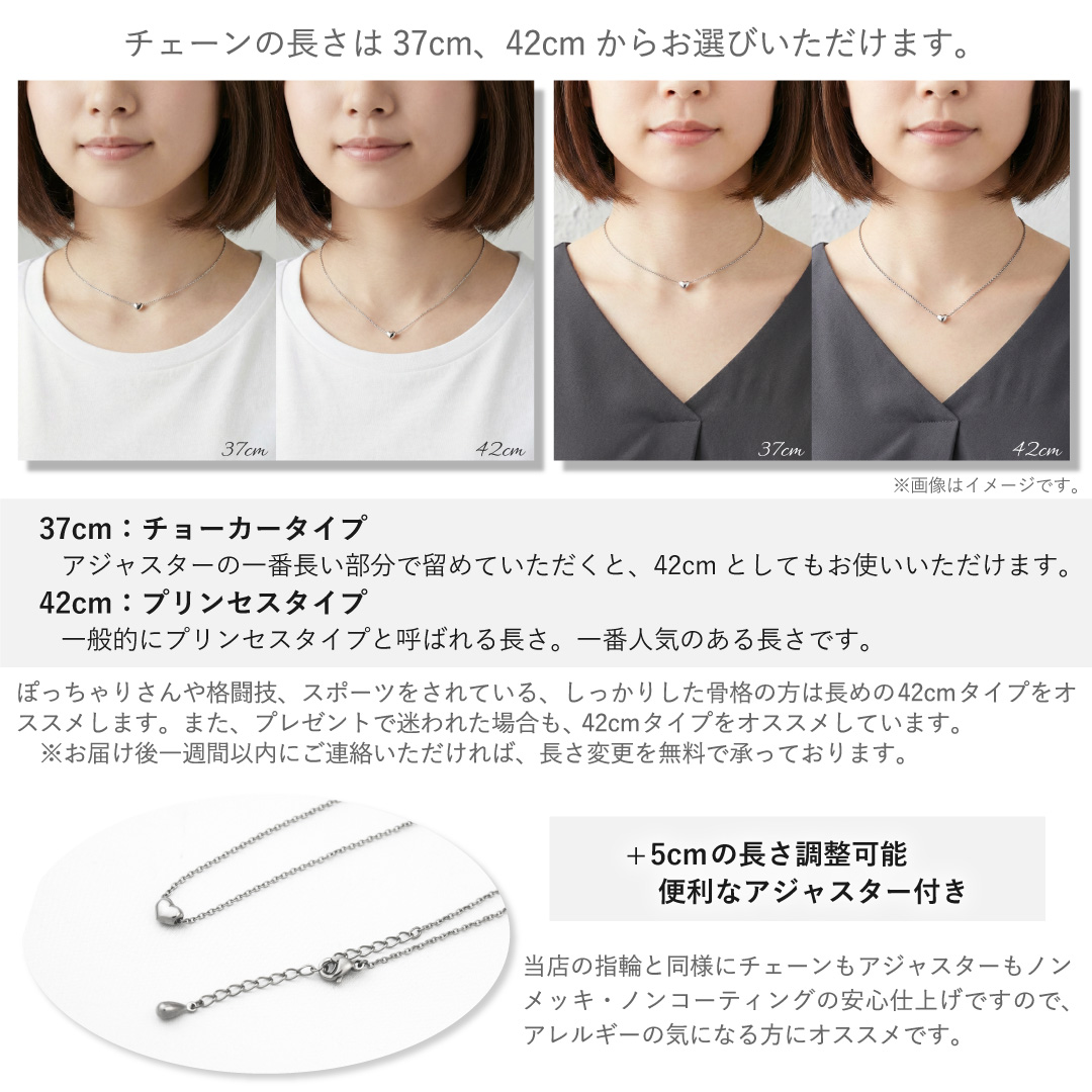 約1mmの繊細なチェーンは、小判型の駒が光を反射する「カットあずき(小判小豆)」と、駒に丸みがあり優しい肌当たりの「丸あずき」をご用意。どちらも長さ調整可能な「+5cm」のアジャスター付きです。