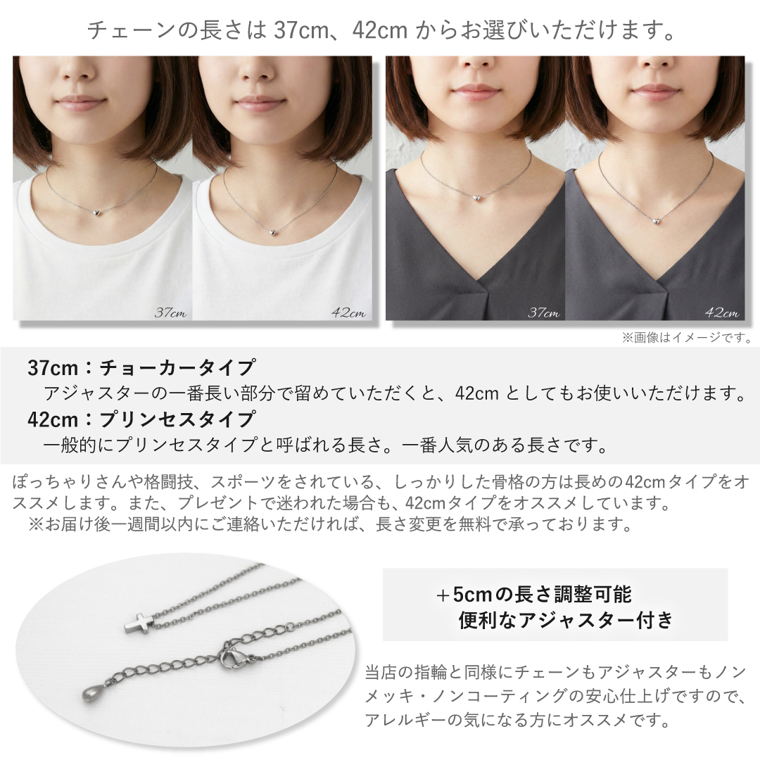 チェーンは、華奢な幅約1mmのあずきチェーン。 長さ調整可能な「+5cm」のアジャスター付きです。