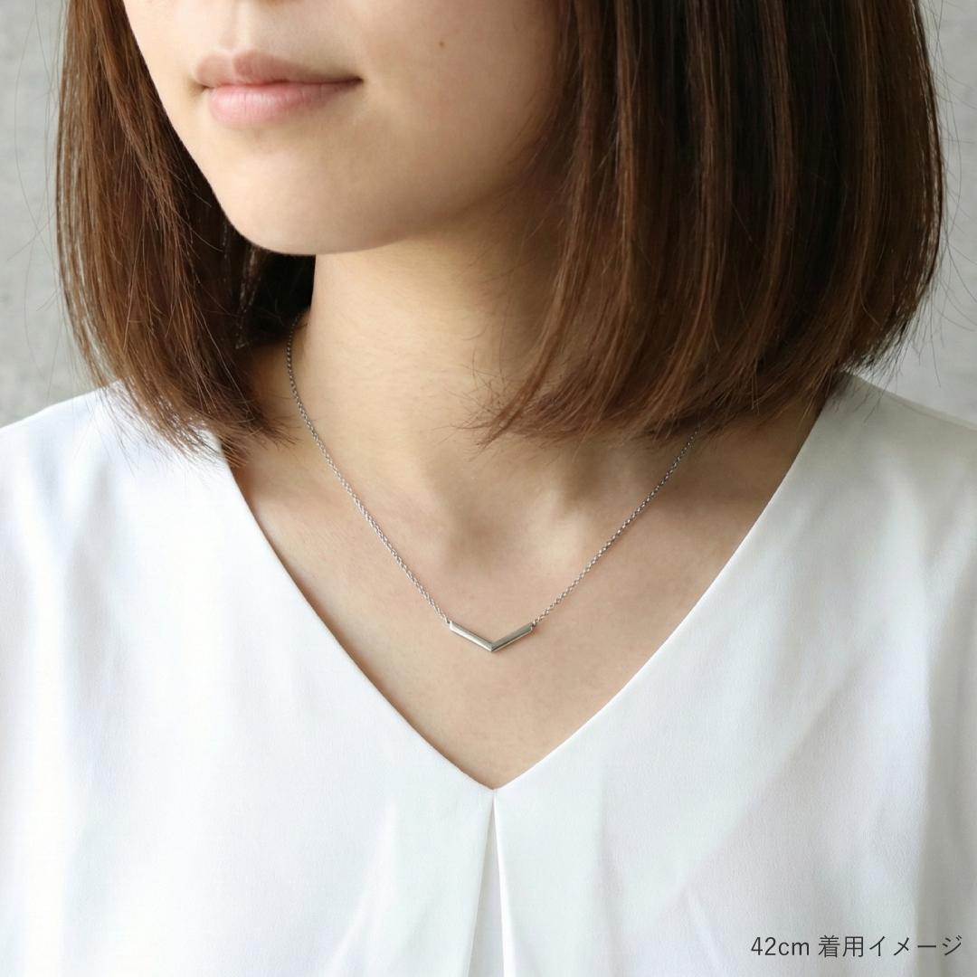 小さめですっきりとしたデザインでのV字のプレートと、首元を綺麗に見せる極細のチェーンが、洗練された雰囲気をつくります。
