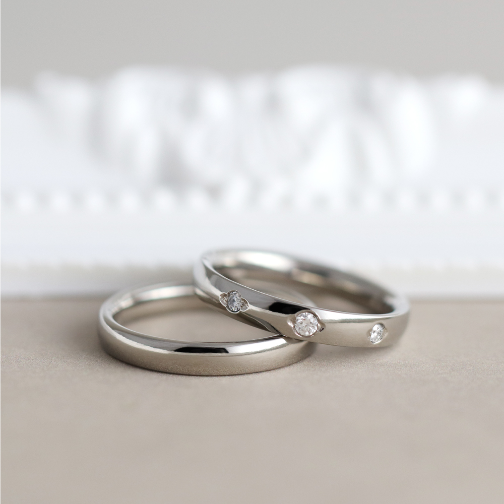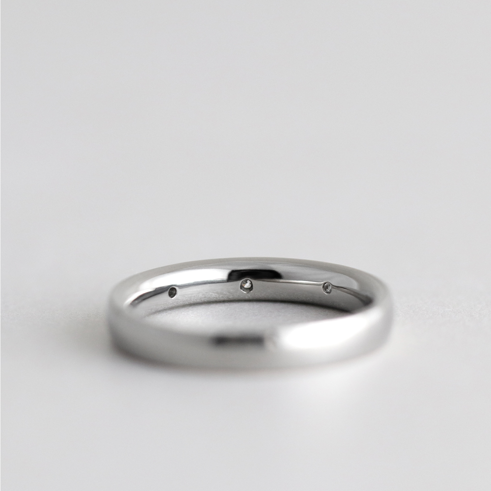 中央のダイヤモンドは、ひときわ明るい輝きで確かな存在感を主張する0.03ct(直径約1.9~2mm)。両サイドには、0.02ctを2石。透明度の高い天然ダイヤモンド合計で0.07ctセッティングいたしました。(少し細い中央が0.02ctタイプもございます