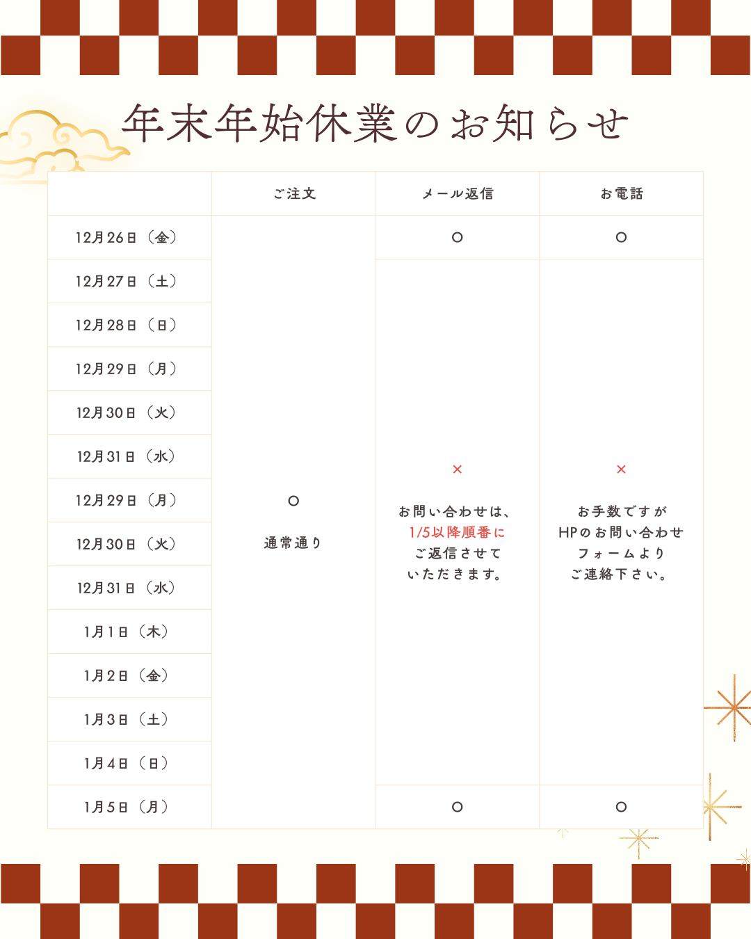 WEBショップでのご注文は、お休み中も24時間いつでも承っております。 受注確認メールの送信、お問い合わせへのご返信、商品の発送業務につきましては、年明け1月5日(月)以降、順次対応させていただきます。