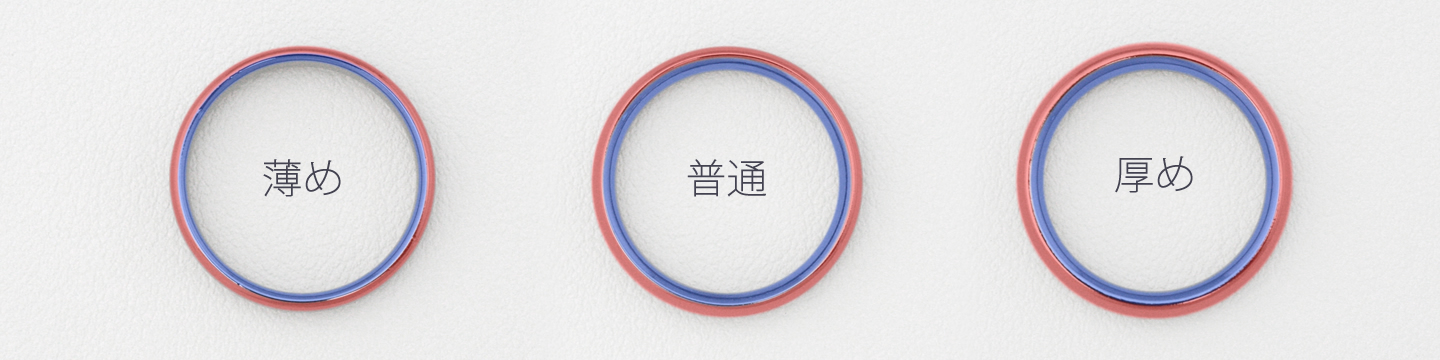 「普通」の厚さは、一般的なプラチナやゴールドのフルオーダーメイドのマリッジリングを参考にしています。