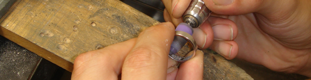 当店では、昔ながらの刃物でリング内側に刃物でけがいて(彫って)刻印しております。