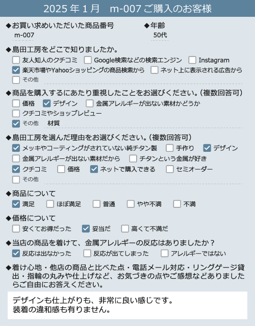 金属アレルギー対応の結婚指輪(マリッジリング・ペアリング)m008、純チタンリングr019のお客様の声2022年10月