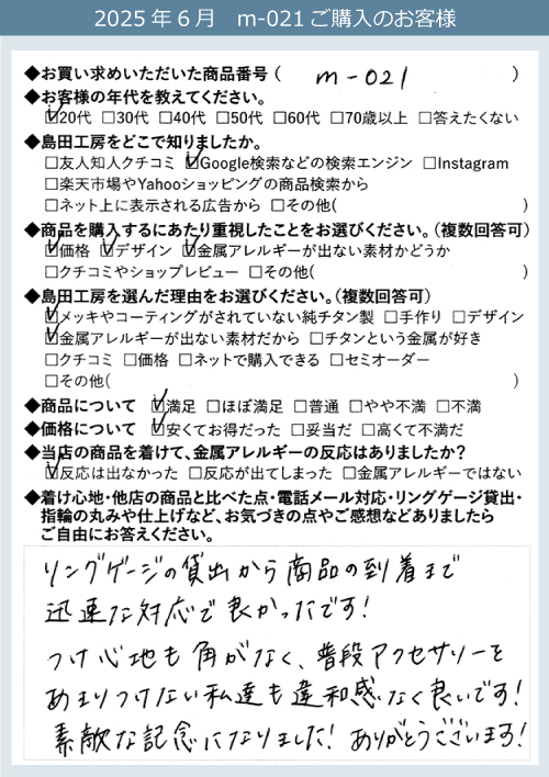 ミラーとヘアラインのコンビ仕上げ甲丸リングペアm-021・単品r-040のお客様の声をまとめました。