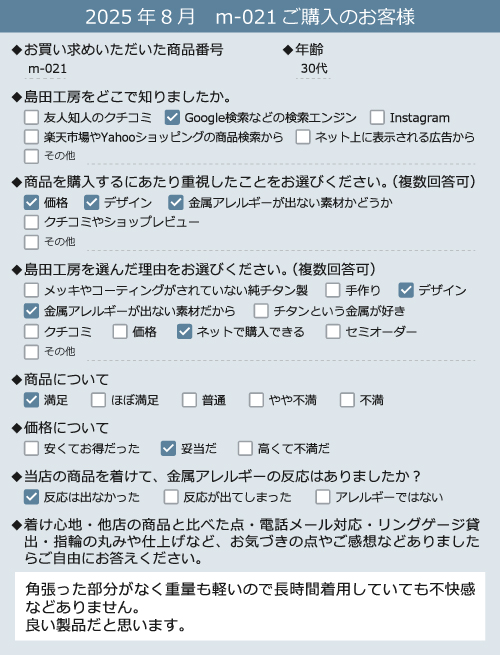 ミラーとヘアラインのコンビ仕上げ甲丸リングペアm-021・単品r-040のお客様の声をまとめました。